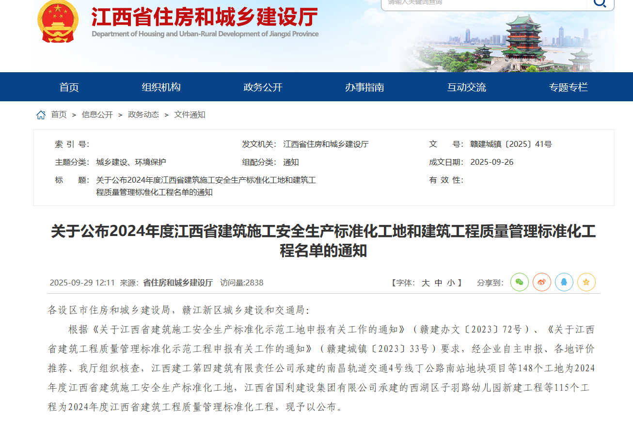 近日,省住建厅公布了《关于公布2024年江西省建筑施工安全生产标准化工地和建筑工程质量管理标准化工程名单的通知》,新区共有11个工程项目成功入选,总体入选率位居全省前列。